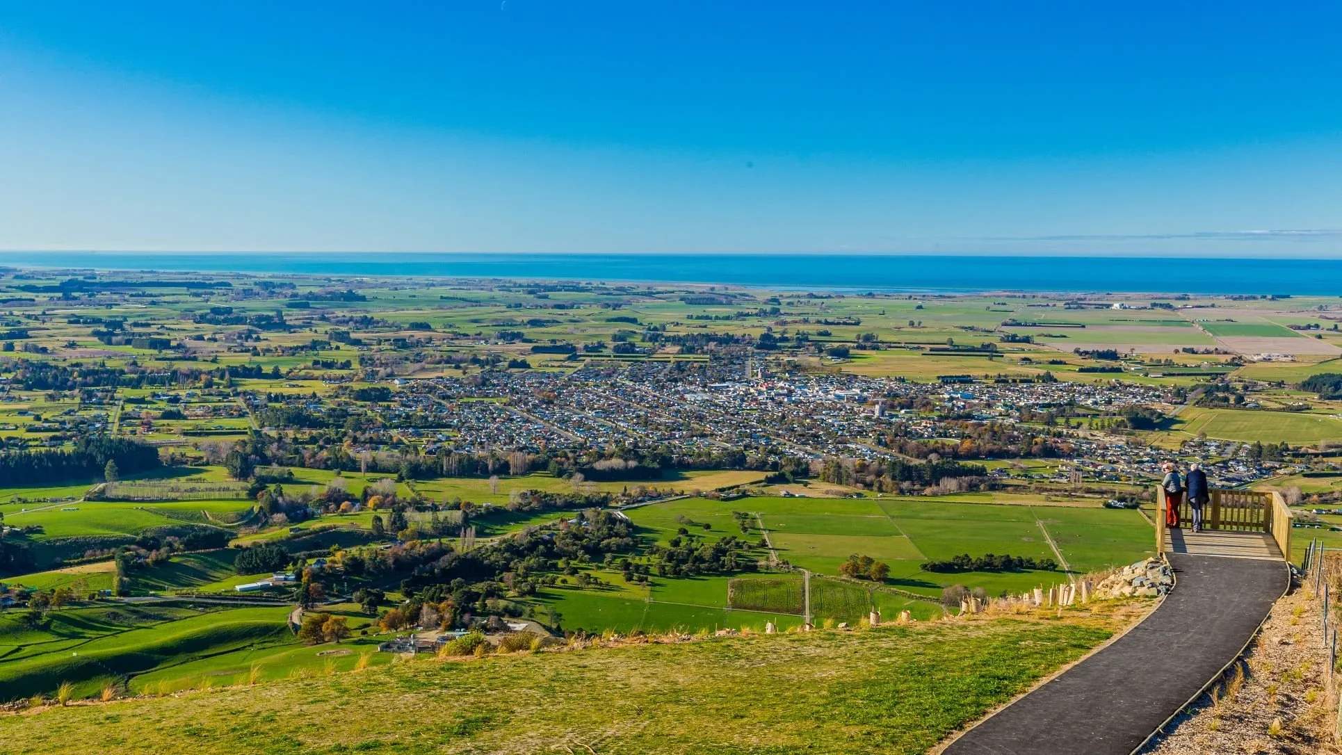 From the top of Centrewood Park the views stretch from the Pacific Ocean across the plains to the Southern Alps. It’s also where visitors can see Waimate’s white horse up-close, stop for a picnic, or look out from the viewing platforms set into the hillside.