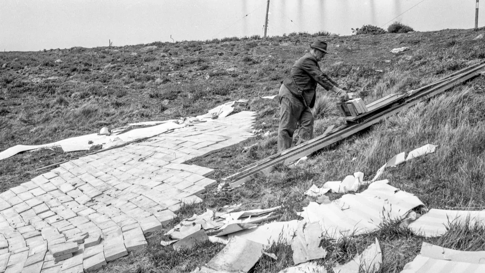 ‘I was given the idea of the White Horse of England, which I tried with wallpaper on the face of the hill. This was the start of the action, but the steep rocky face of the hill was too heartbreaking to smooth over. My next move was to the smooth valley close by, not so good for viewing, but where I could work myself. A load of plaster board scrap from the dump, laid in outline, proved the monument would be too small, but I was in business, and ordered 200 paving stones.’